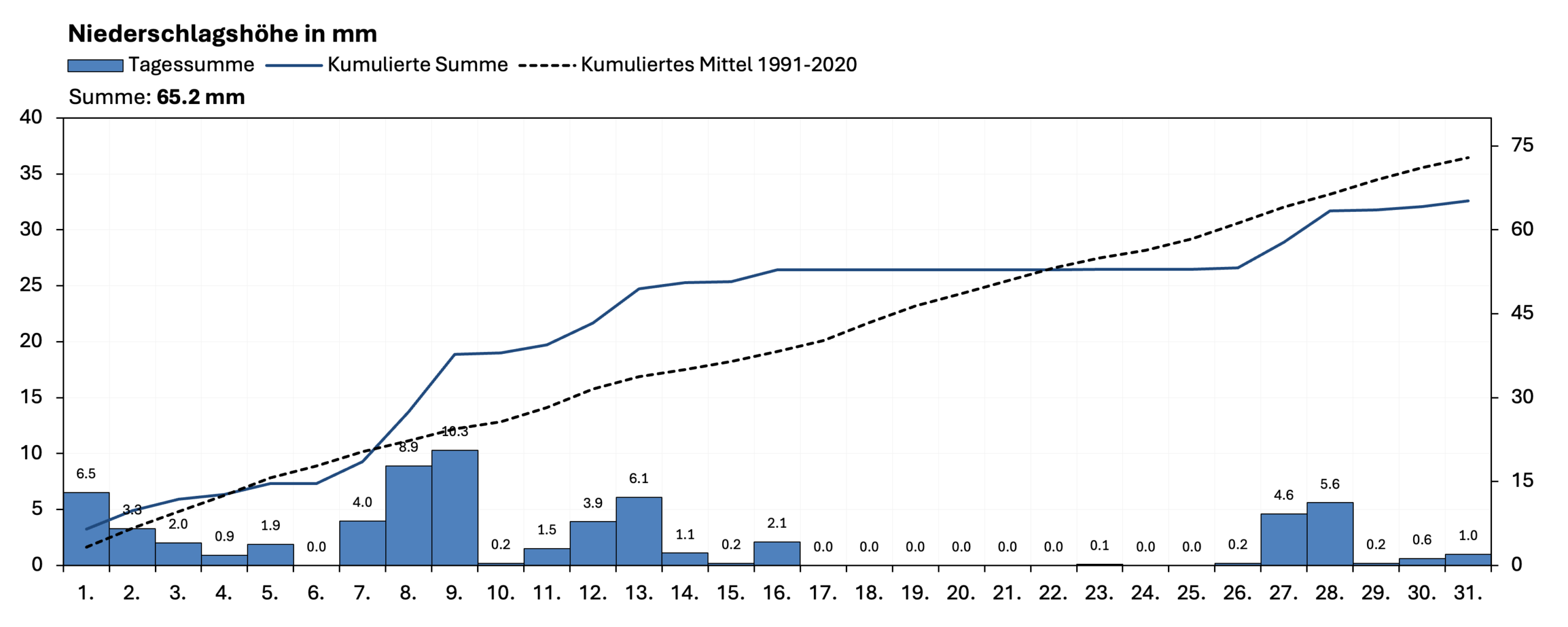 Mit einer Monatsniederschlagssumme von 32,0 mm war der Mai deutlich zu trocken. Es fielen nur etwa 54 % des langjährigen Mittels (59,7 mm, 1991–2020). Besonders markant: In den ersten drei Wochen des Monats blieb es komplett niederschlagsfrei – eine in dieser Länge durchaus außergewöhnliche Trockenphase.